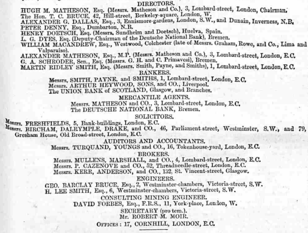 Prospectuses and forms of application can be obtained at the company’s office, or of Messrs. Matheson and Co., 3 Lombard Street, London, E.C., of the company’s bankers and brokers.