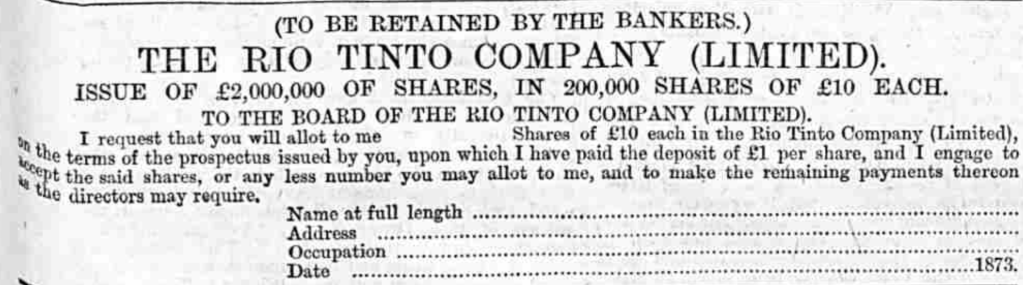 The company has been formed with the principal object of purchasing and developing the well-known mining property of Rio Tinto, the the South of Spain, containing the richest and most important of all the great mineral deposits with extend from Seville to beyond the mines of Santo Domingo in Portugal. The property is freehold in perpetuity, and contains 4,710 English acres in one connected tract, embracing nearly the whole of the town of Rio Tinto. The celebrated Tharsis mine is situated on the same mineral range.